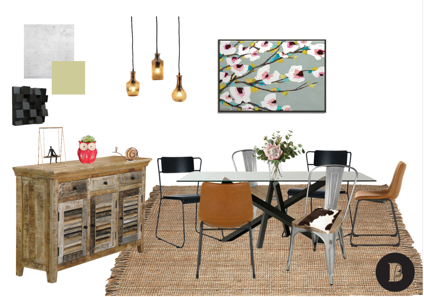 Create a dining space full of charm and individuality with this rustic-modern design.